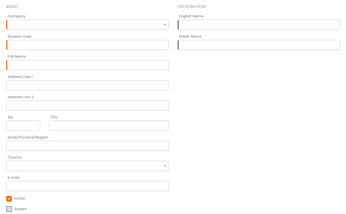 Division – nazwa oddziału utworzonego wcześniej w sekcji Administration => Division