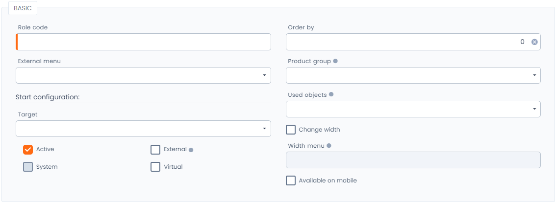 Avaible on mobile – czy rola ma być dostępna na urządzeniach mobilnych, tzn. czy można skonfigurować dla niej komponent MOBILE MENU, który stanowi główne menu aplikacji dla bieżącej roli