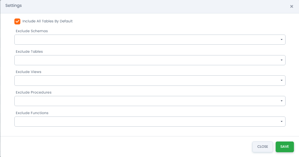 • Exclude Schemas – Lista rozwijana schematów pozwalająca na wybranie elementów bazodanowych wybranym przez nas schemacie