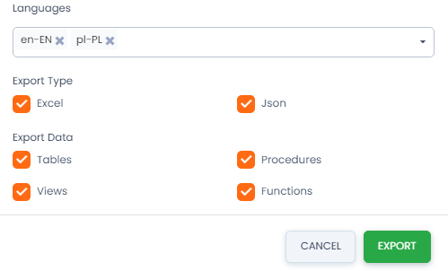 • Export Data – elementy bazodanowe, których dokumentacje chcemy wyeksportować