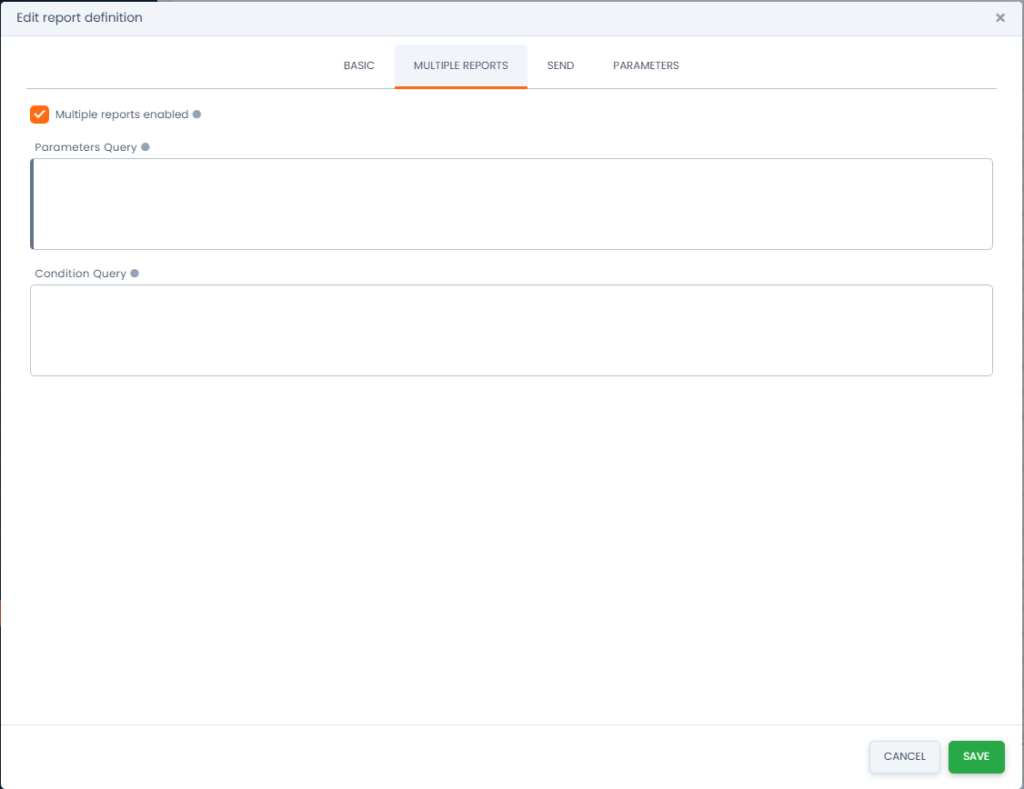 - Multiple reports enabled – (check-box) – oznaczenie pozwala na generowanie wielu raportów – po włączeniu raport będzie generowany dla każdego wiersza z Parameters Query, jednak tylko wtedy, gdy Condictional Query zwróci jakikolwiek wiersz,