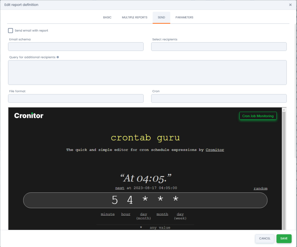 - Select recipients -wskazanie wcześniej przygotowanej listy odbiorców, do których przesłany ma zostać raport w postaci załącznika do wiadomości,