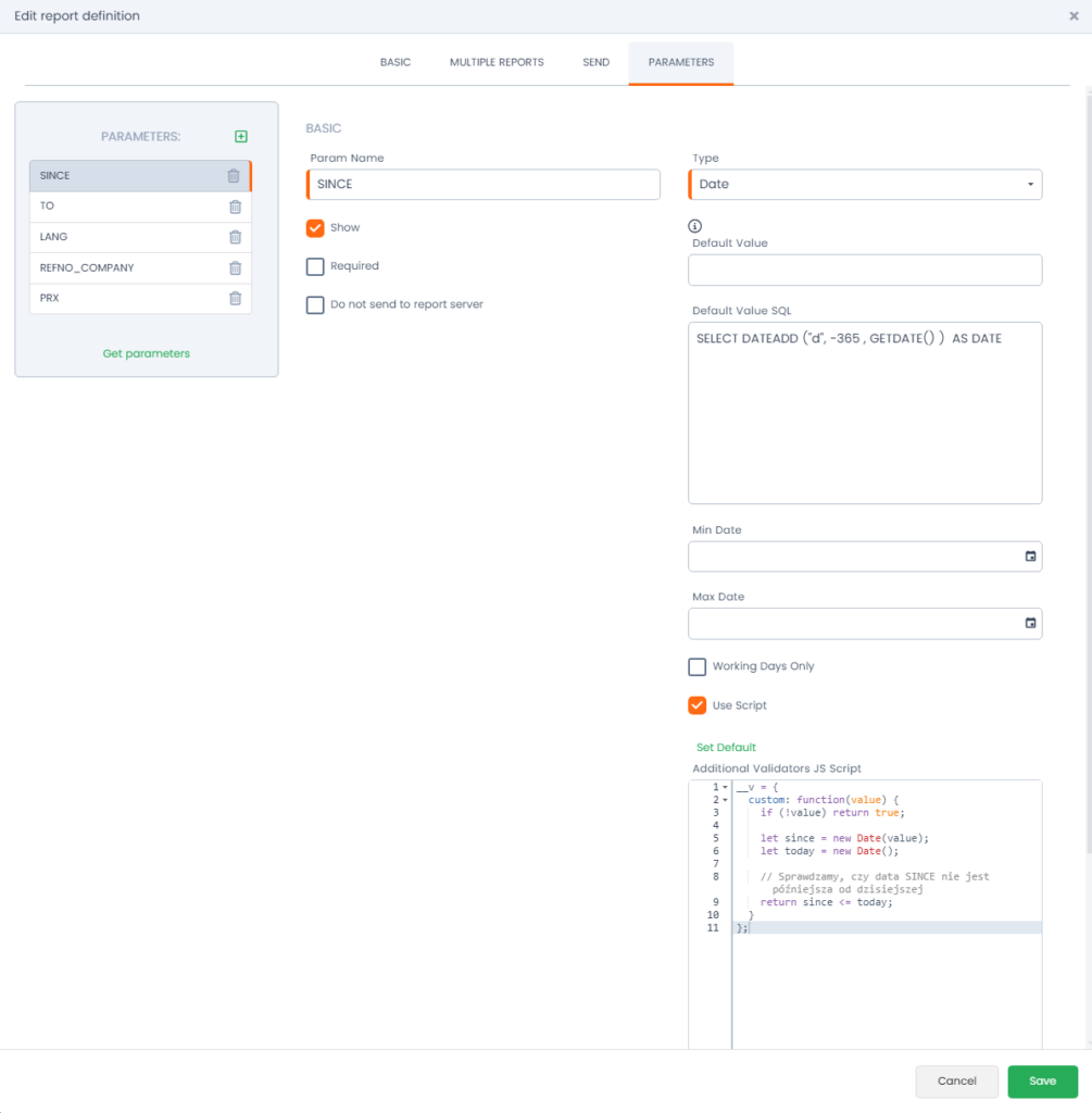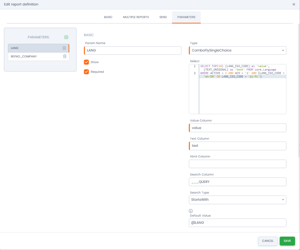 - DEFAULT VALUE SQL – wartość domyślna podstawiana w kontrolce po wygenerowaniu raportu, wynikająca z zapytania do bazy danych np.: