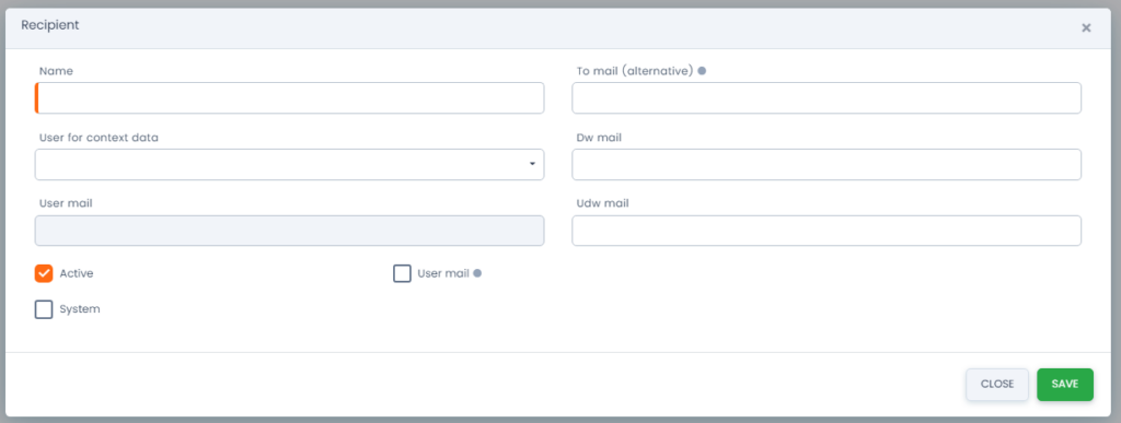 - Active – oznaczenie aktywności listy odbiorców, nieaktywne listy nie pojawiają się w polach wyboru podczas konfiguracji innych elementów oraz podpinania w programie,