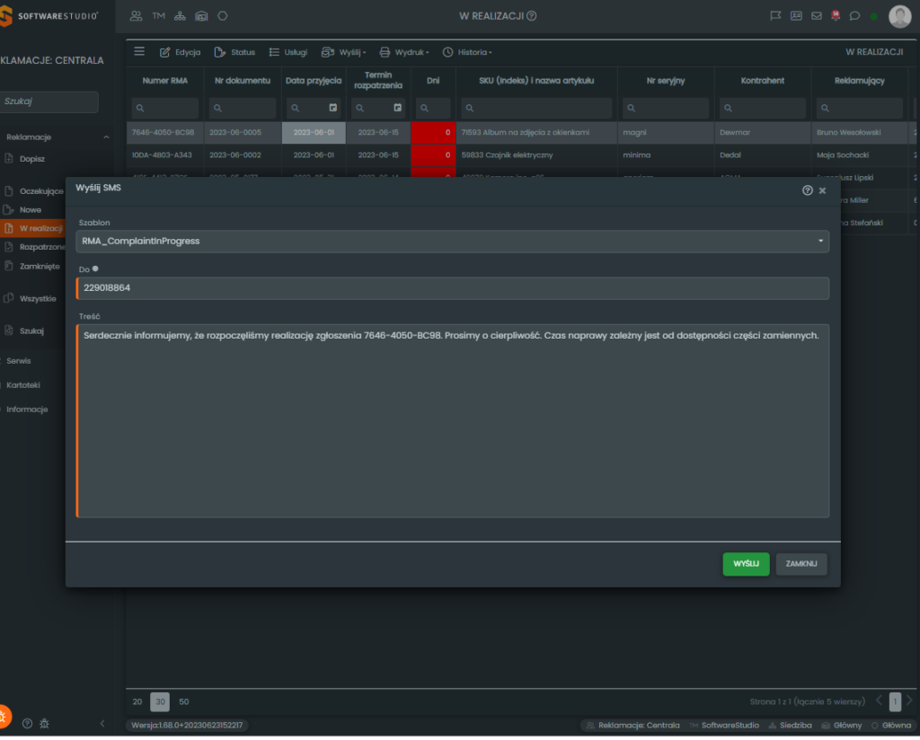 Definicja Send SMS pozwala przygotować gotowy komponent wysyłki SMS do podpięcia w odpowiednim miejscu w programie, na przykład, jako polecenie w pasku toolbarmenu zestawienia. Wysyłka SMS jest również możliwa w tle w postaci wiadomości automatycznej, na skutek spełnienia się określonych warunków (np. po zmianie statusu zgłoszenia). W definicji określa się elementy takie jak szablon wiadomości, odbiorców, czy konto SMS, z którego ma nastąpić wysyłka, a także możliwość (lub jej brak) edycji gotowego szablonu tekstowego przed wysyłką.