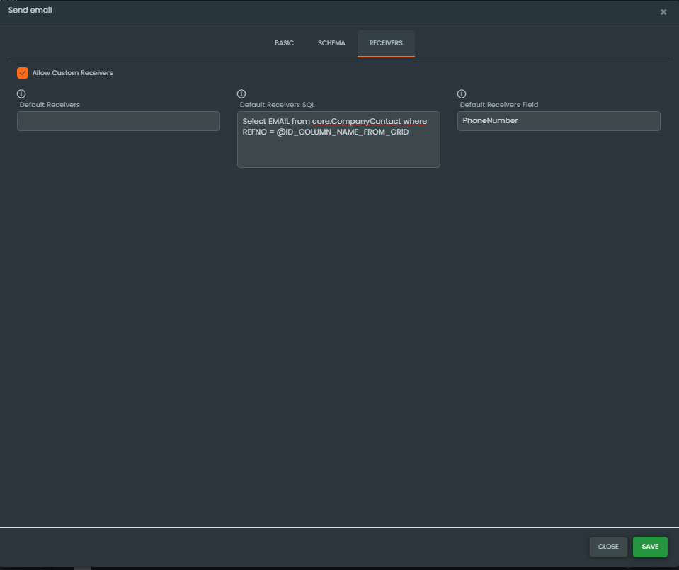 Select EMAIL from core.CompanyContact where REFNO = @ID_COLUMN_NAME_FROM_GRID - Default Receivers Field – Lista odbiorców pobierana z wskazanej kolumny (Fields); Priorytetowość – najwyższa