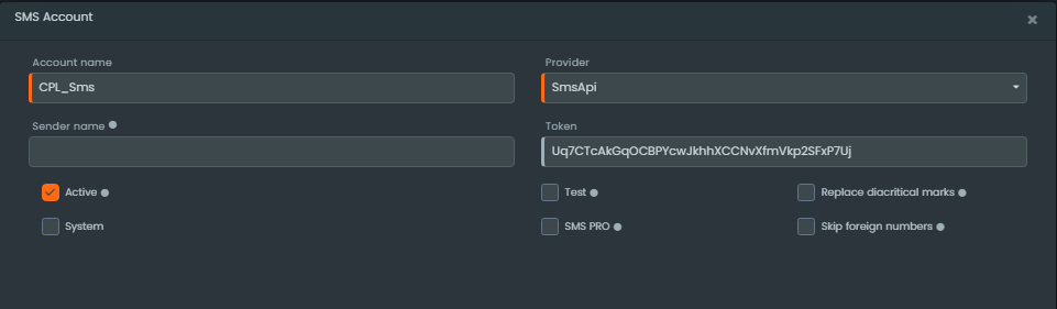 - Account name – nazwa techniczna konta SMS wykorzystywana w programie