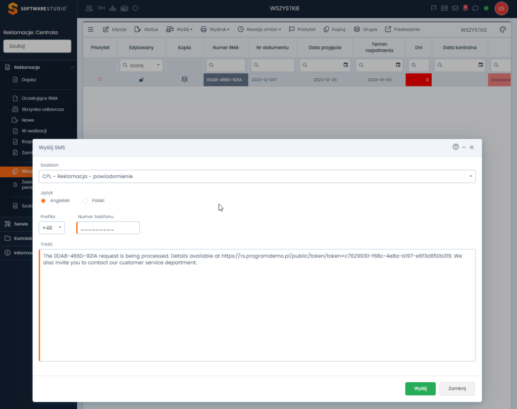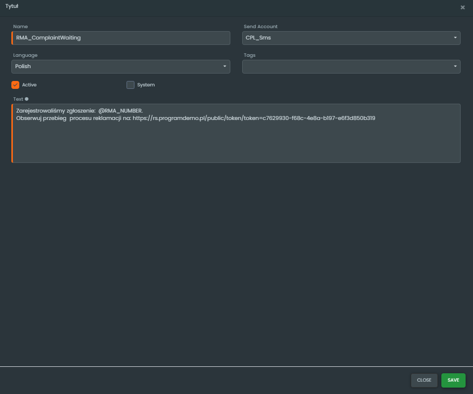 - Text – Treść wiadomości, zastosowanie parametrów @ pozwoli na uzupełnienie treści danymi zaciągniętymi z bazy np.: @RMA_NUMBER