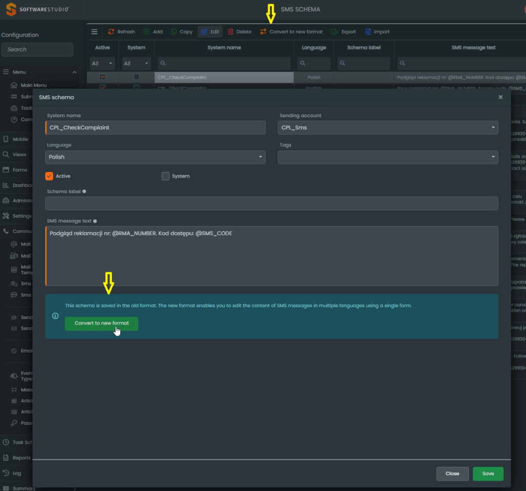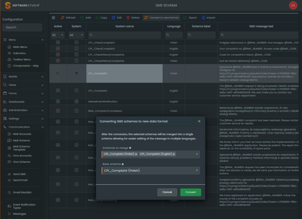 Uprzednio stworzone schematy można przekształcić w schemat wielojęzyczny za pomocą polecenia „Convert to new format” dostępnego w toolbarze lub w formularzu edycji schematu.