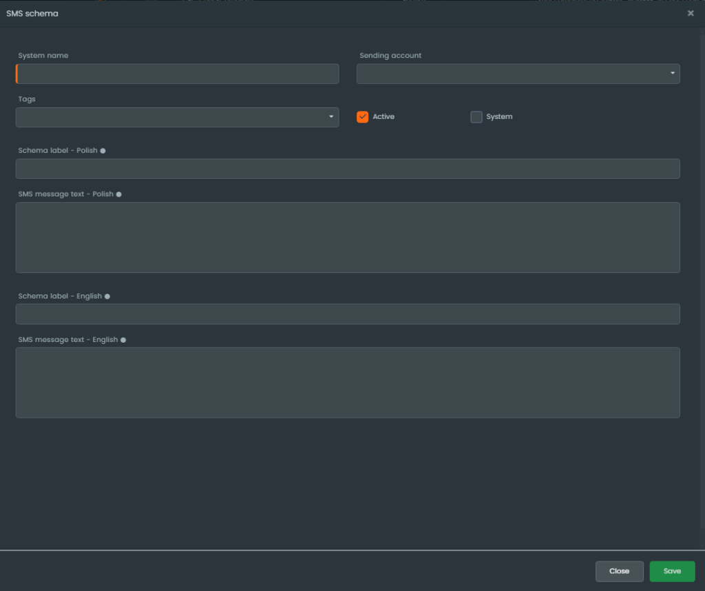 Osoba konfigurująca może utworzyć schemat obsługujący jednocześnie kilka języków. W tym celu należy utworzyć skorzystać z nowego formularza dodawania schematu SMS. Schematy wielojęzyczne oznaczone są w kolumnie „language” przypisem „(Translate)”. Formularz został rozszerzony o pola opisowe w dodatkowych językach oraz pola „Schema label – [kod języka]”, gdzie możliwe jest określenie nazwy każdego ze schematów wyświetlanej zgodnie z aktualnym kontekstem pracy użytkownika.